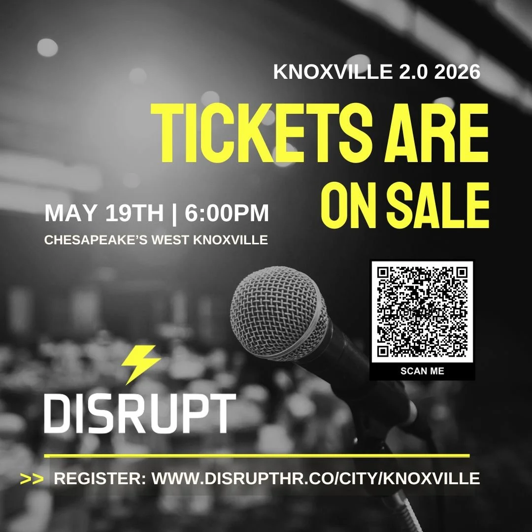 DisruptHR Knoxville 2.0 Tuesday, May 19, 2026 6:00 PM Wednesday, May 20, 2026 8:30 PM Chesapeake's West Knoxville 9630 Parkside Drive Knoxville, TN, 37922 United States (map) Google Calendar ICS Register Now